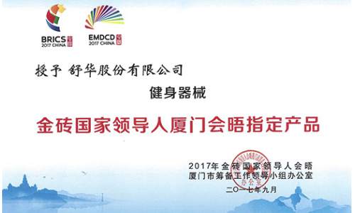 2017年,bbin视讯健身器材入驻厦门金砖国家领导人会晤,并成为厦门金砖会晤指定健身器械。X6豪华智能家用跑步机荣获中国好设计金奖。 2017, Shuhua fitenss equipment presented itself in Xiamen as the designated fitness equipmentof Xiamen BRICS summit. X6 luxurious home use treadmill won gold award of China Good Design.